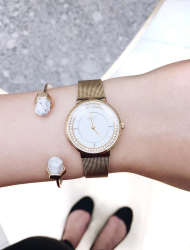 - женские часы декорированы изысканными кристаллами. Большую прелесть изделиям придает желтое либо розовое покрытие;