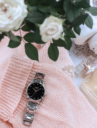 - женские часы декорированы изысканными кристаллами. Большую прелесть изделиям придает желтое либо розовое покрытие;